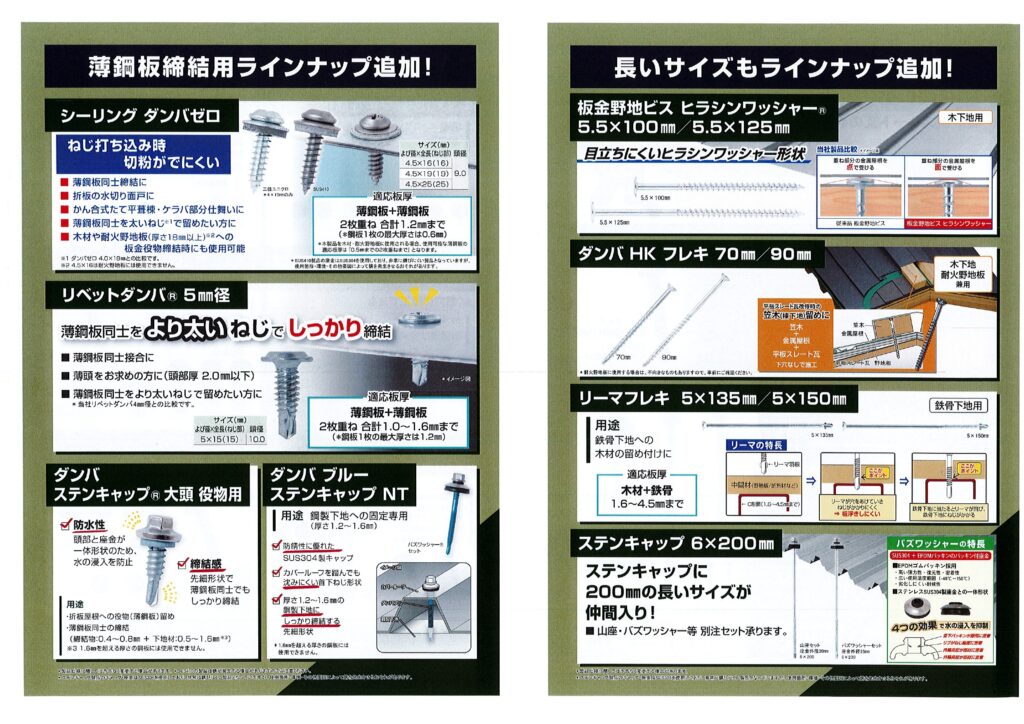 この他にも木工から金属、内装、外装まで、幅広い用途に対応するビスを取り揃えておりますので、ぜひ製品選びの参考にご覧ください。